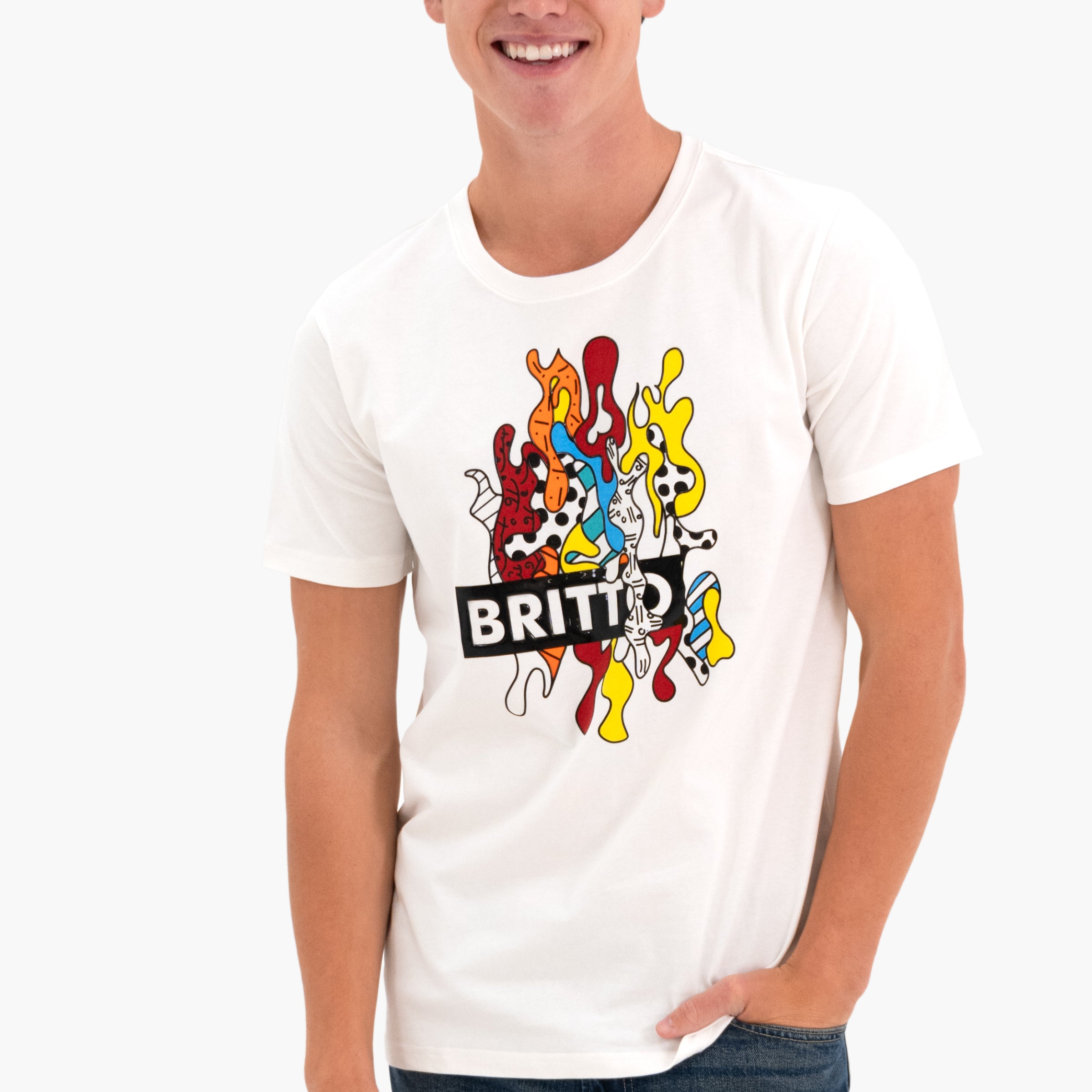 Introducing the BRITTO T-Shirt – a wearable canvas of art and comfort. Made from 100% cotton, this shirt offers a soft touch against the skin. The rib-knit neck collar adds a classic touch, while the silicone patch logo brings a subtle yet distinctive detail. The mixed textured printing adds depth and vibrancy, transforming this t-shirt into a dynamic expression of Britto's designs.