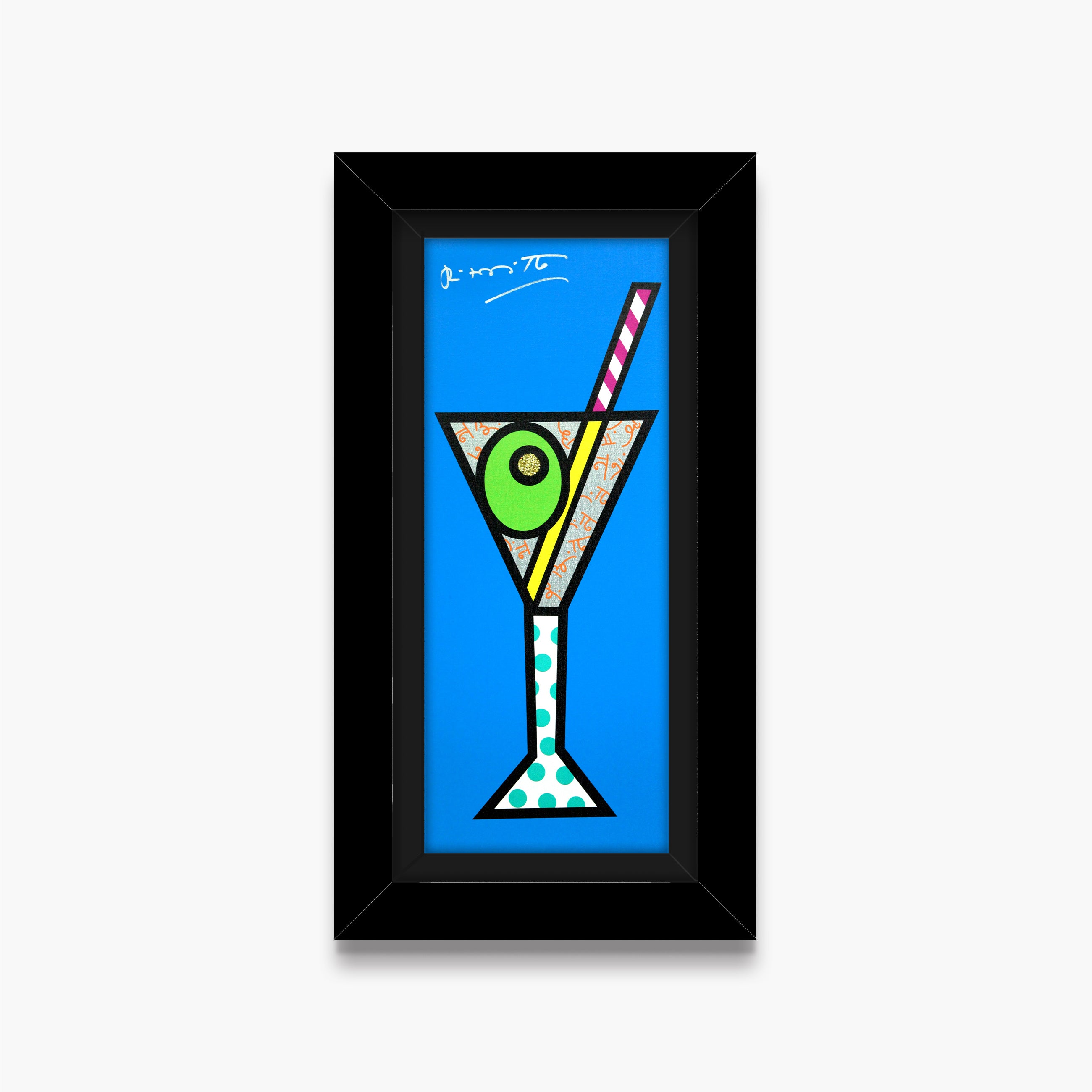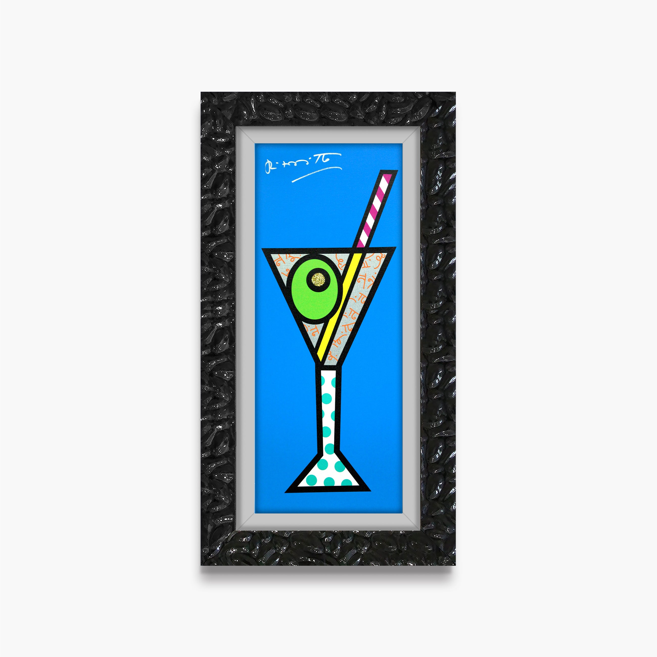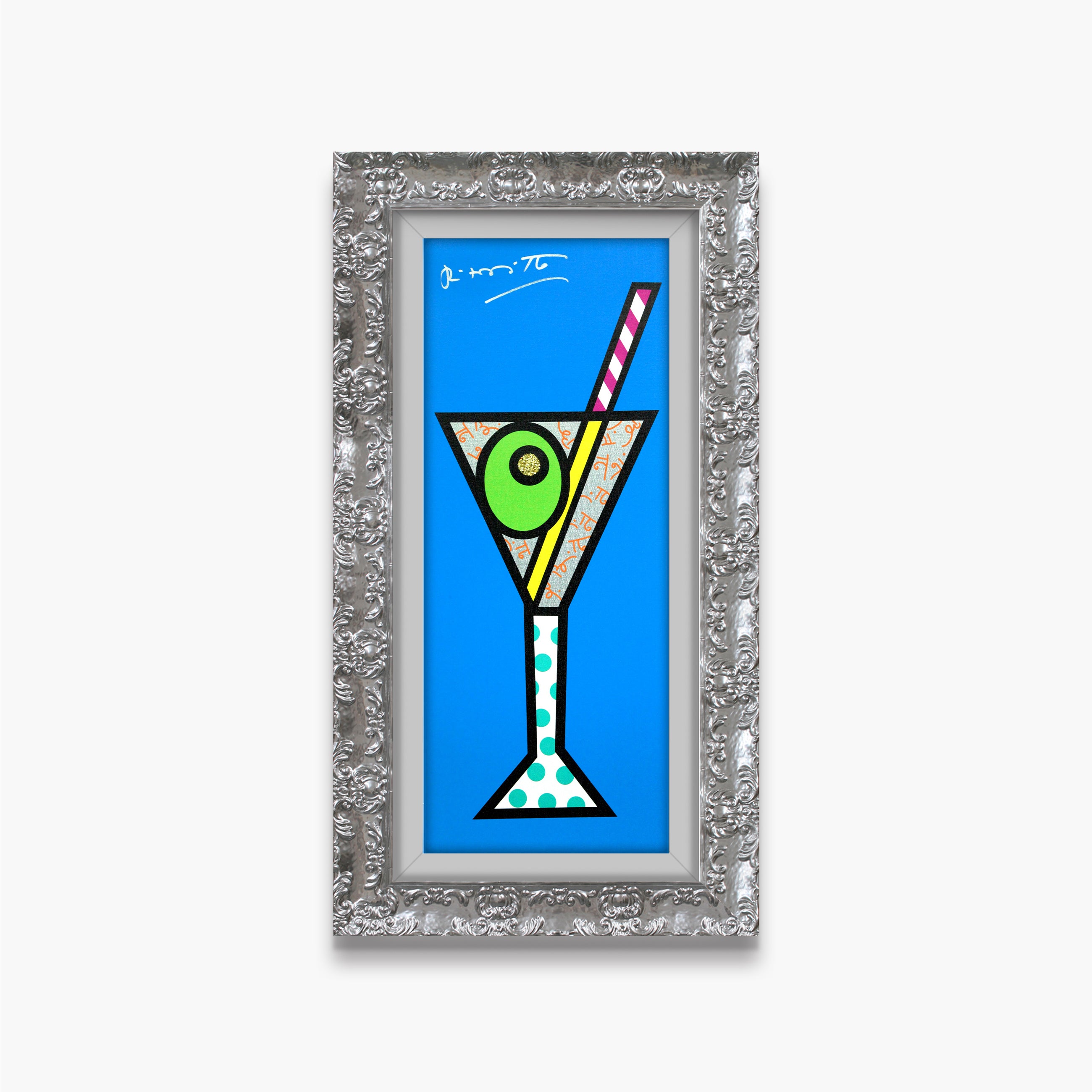Blue Martini is a lively celebration of sophistication, leisure, and modern glamour, infused with Romero Britto’s unmistakable pop-art energy. The elongated composition highlights bold patterns and vibrant hues, transforming a classic cocktail motif into a playful symbol of joy and indulgence. Enhanced with shimmering Diamond Dust, the artwork sparkles with movement and optimism, capturing Britto’s signature ability to elevate everyday moments into radiant expressions of happiness and style.