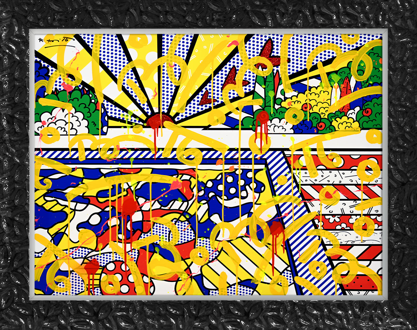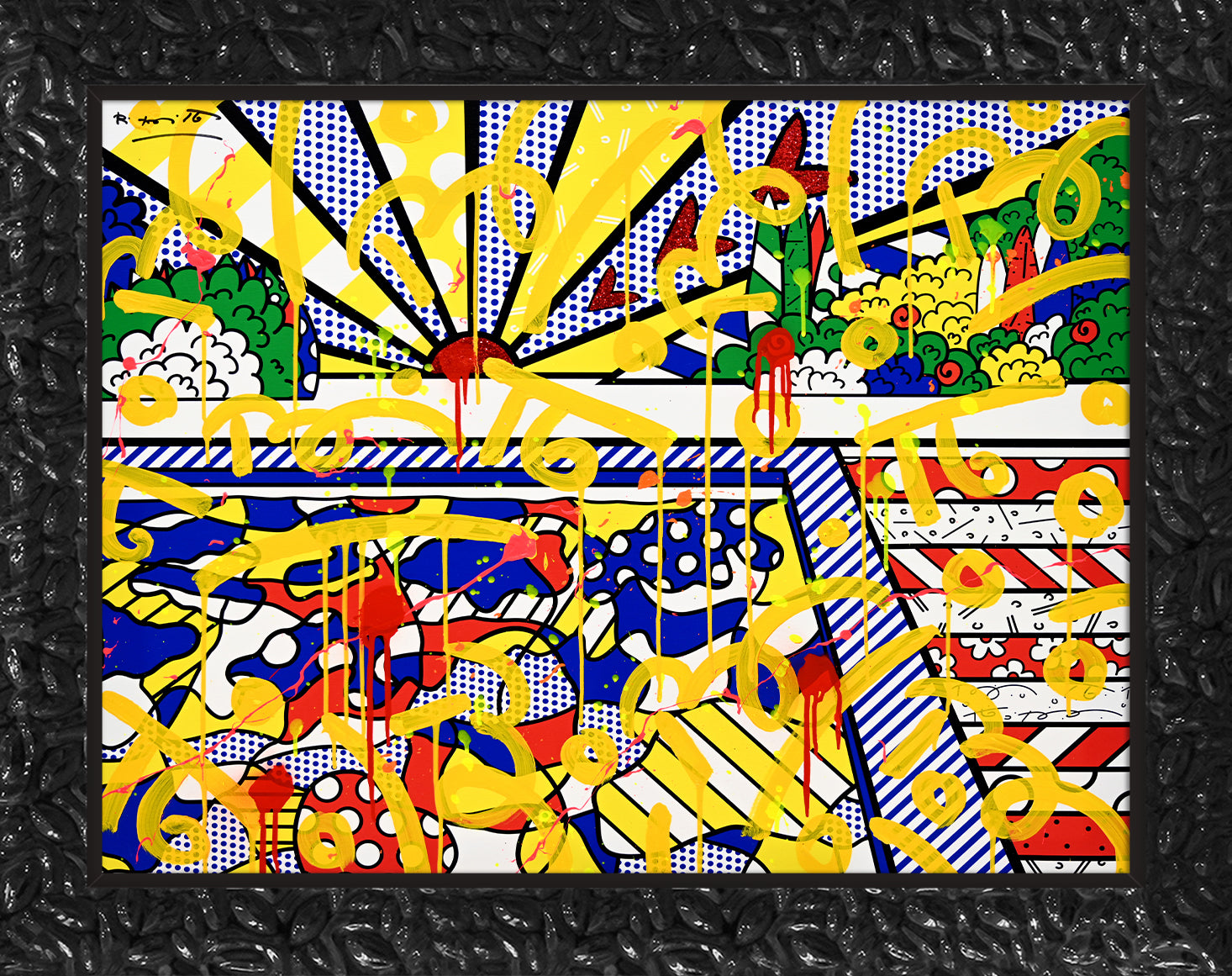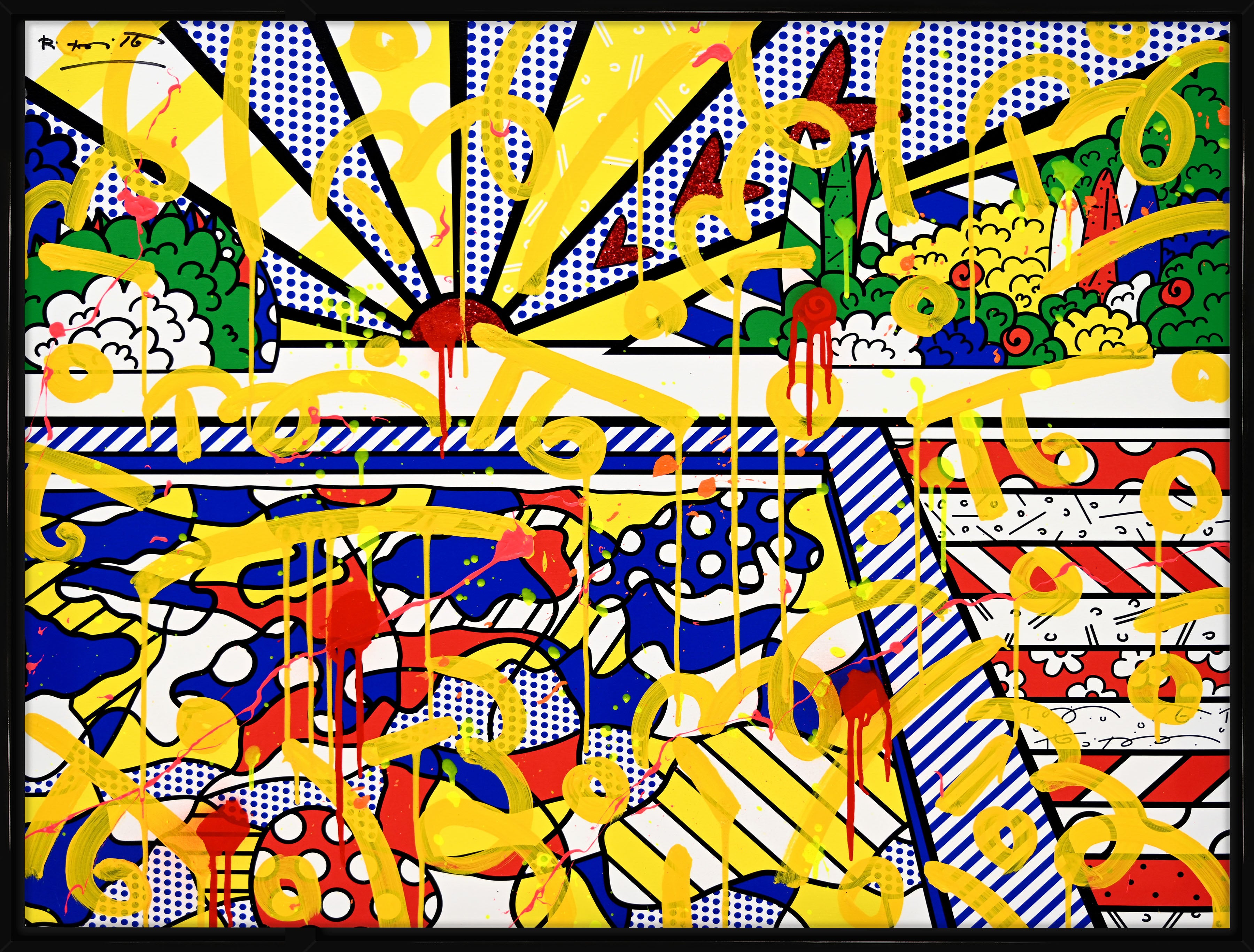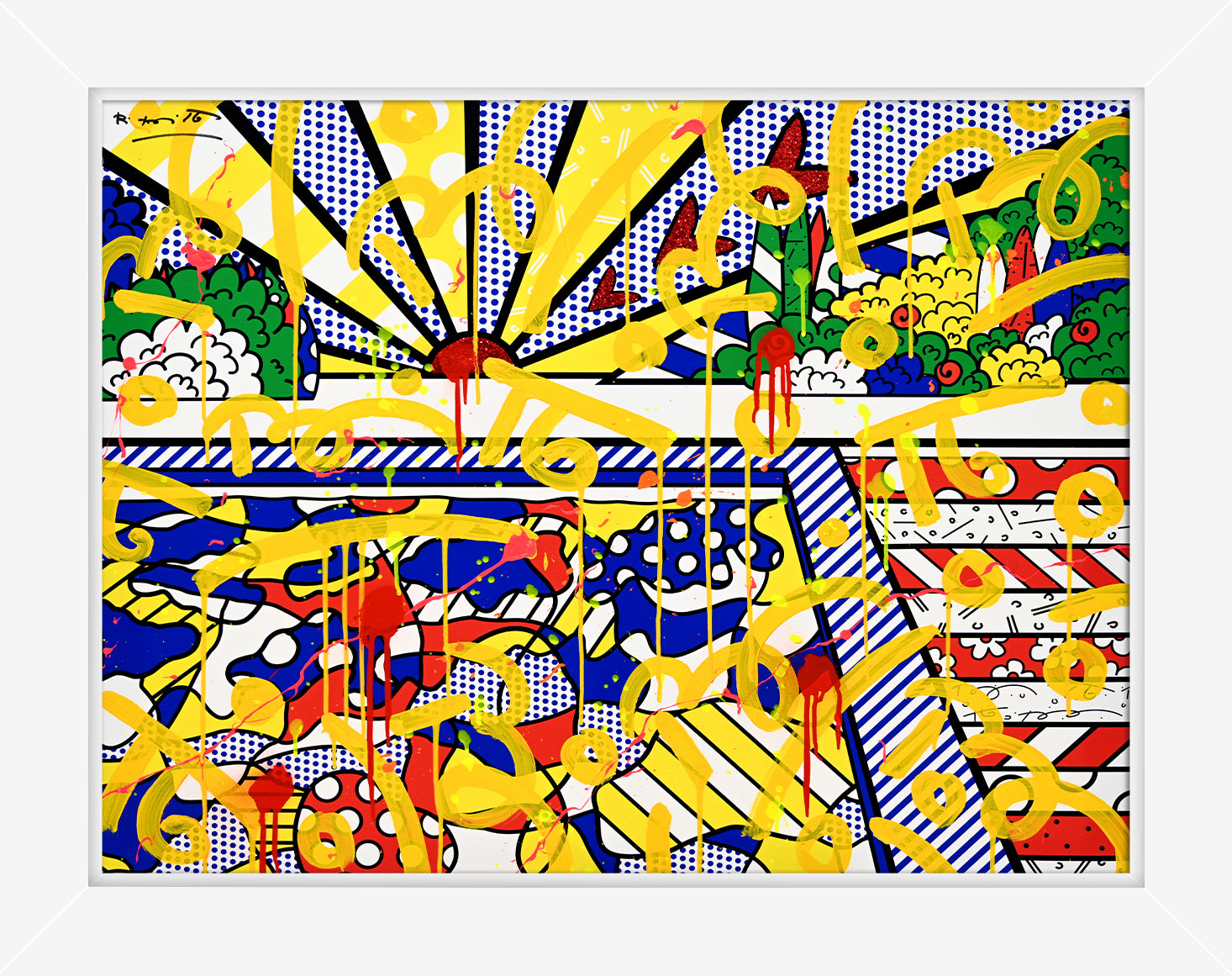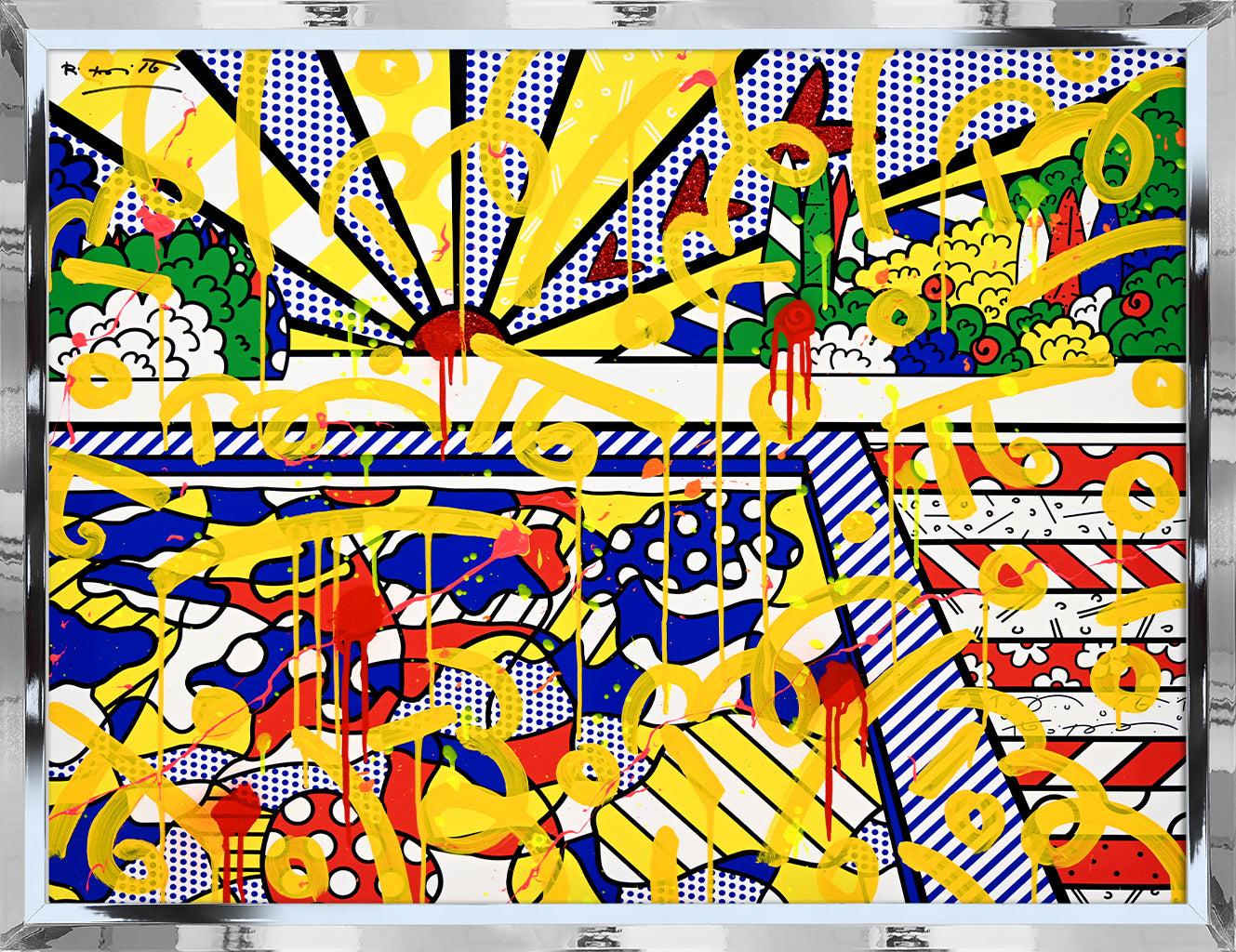 “California Pool” is a lively mixed media original that captures the sun-soaked energy and vibrant lifestyle of California poolside scenes. Using acrylic paint, oil pen, and spray paint on canvas, and enhanced with diamond dust embellishments, Romero Britto transforms this everyday leisure moment into a bold, colorful pop-art composition full of joy, movement, and contemporary visual excitement.