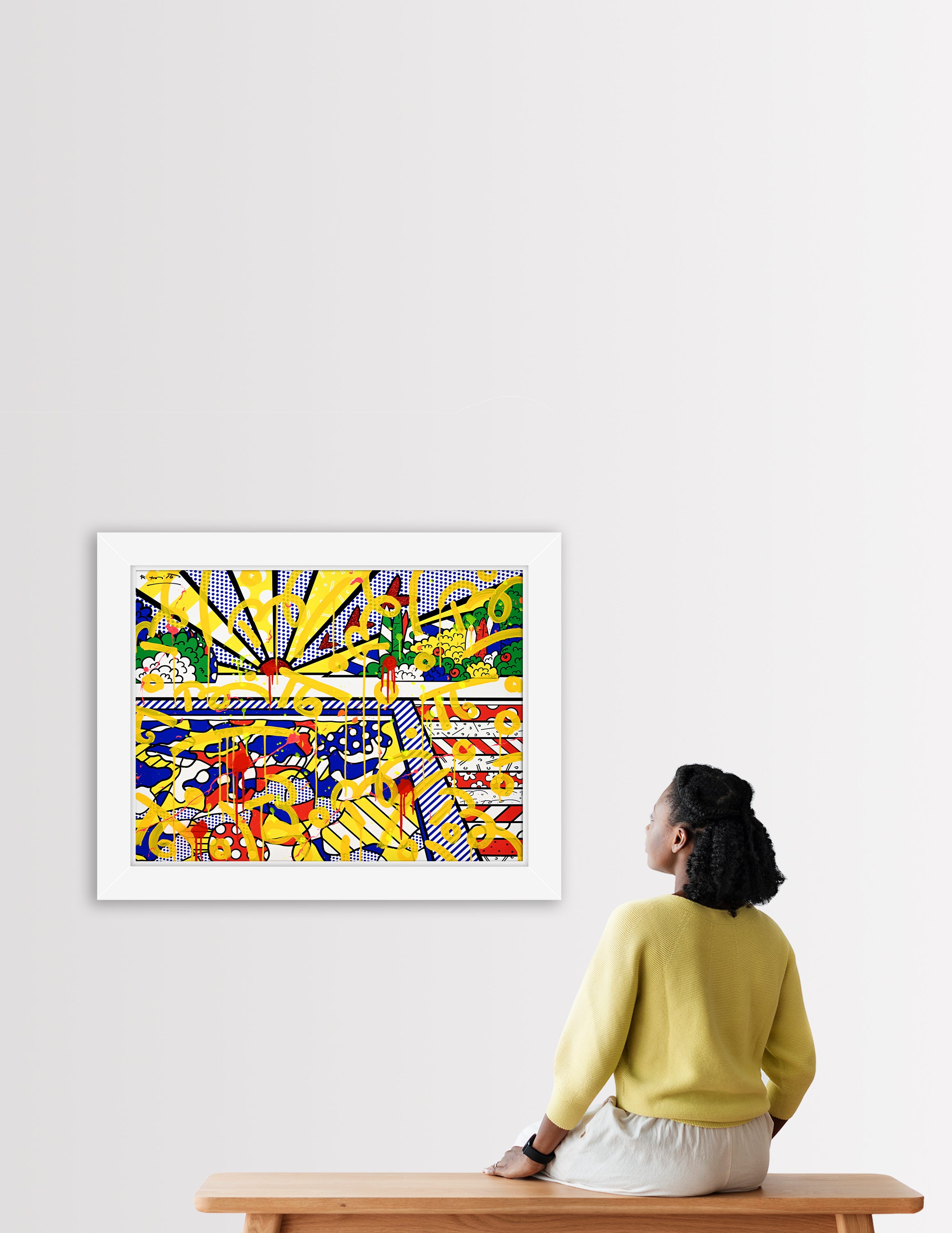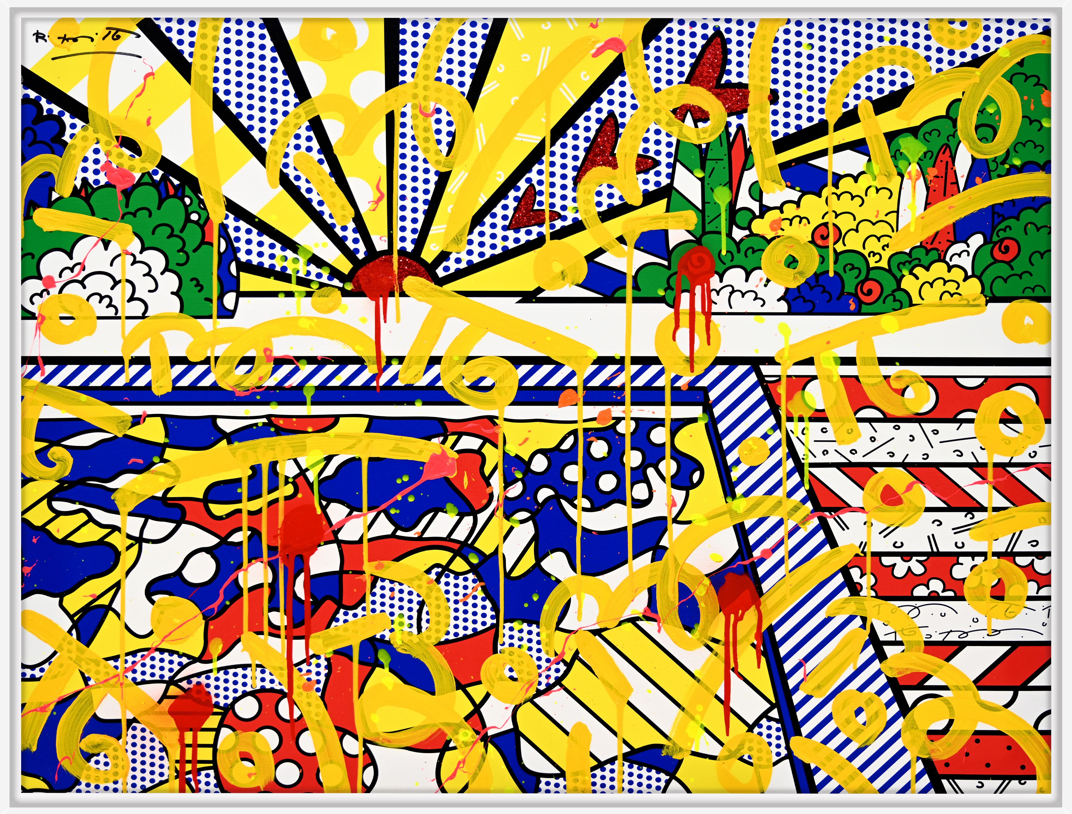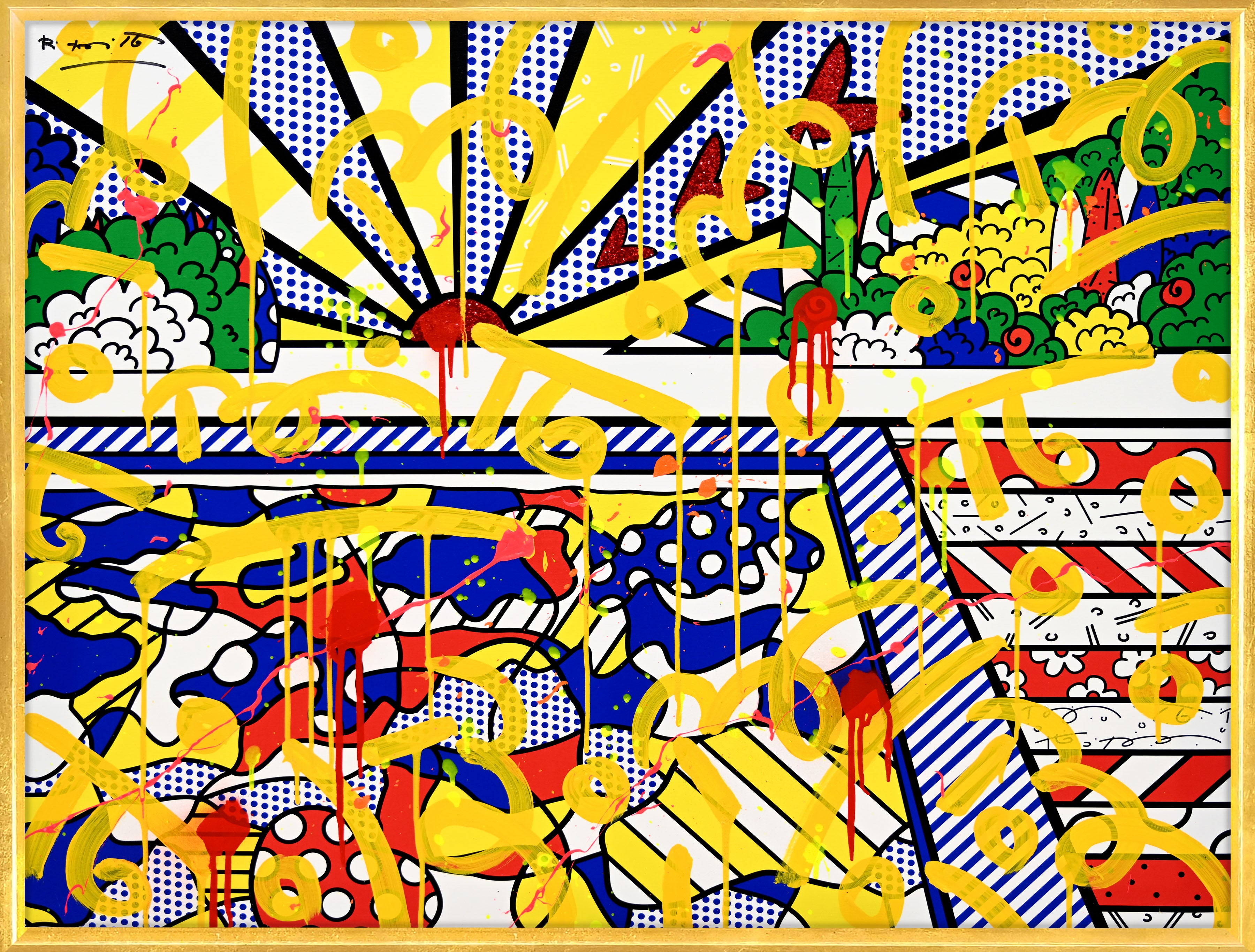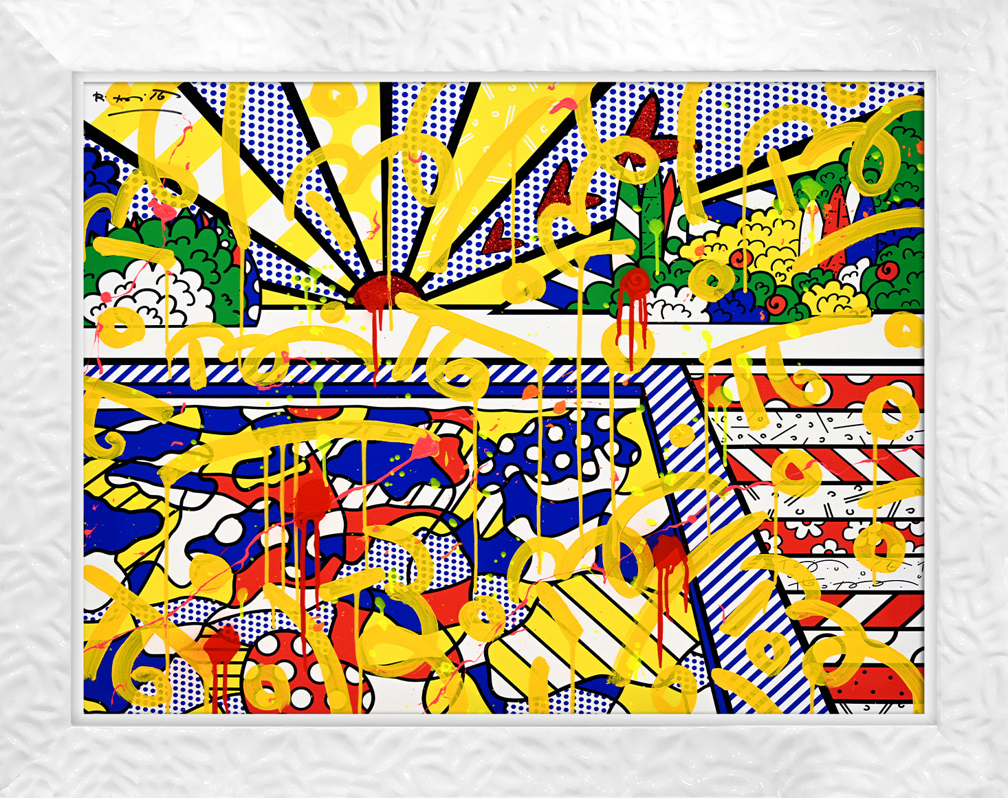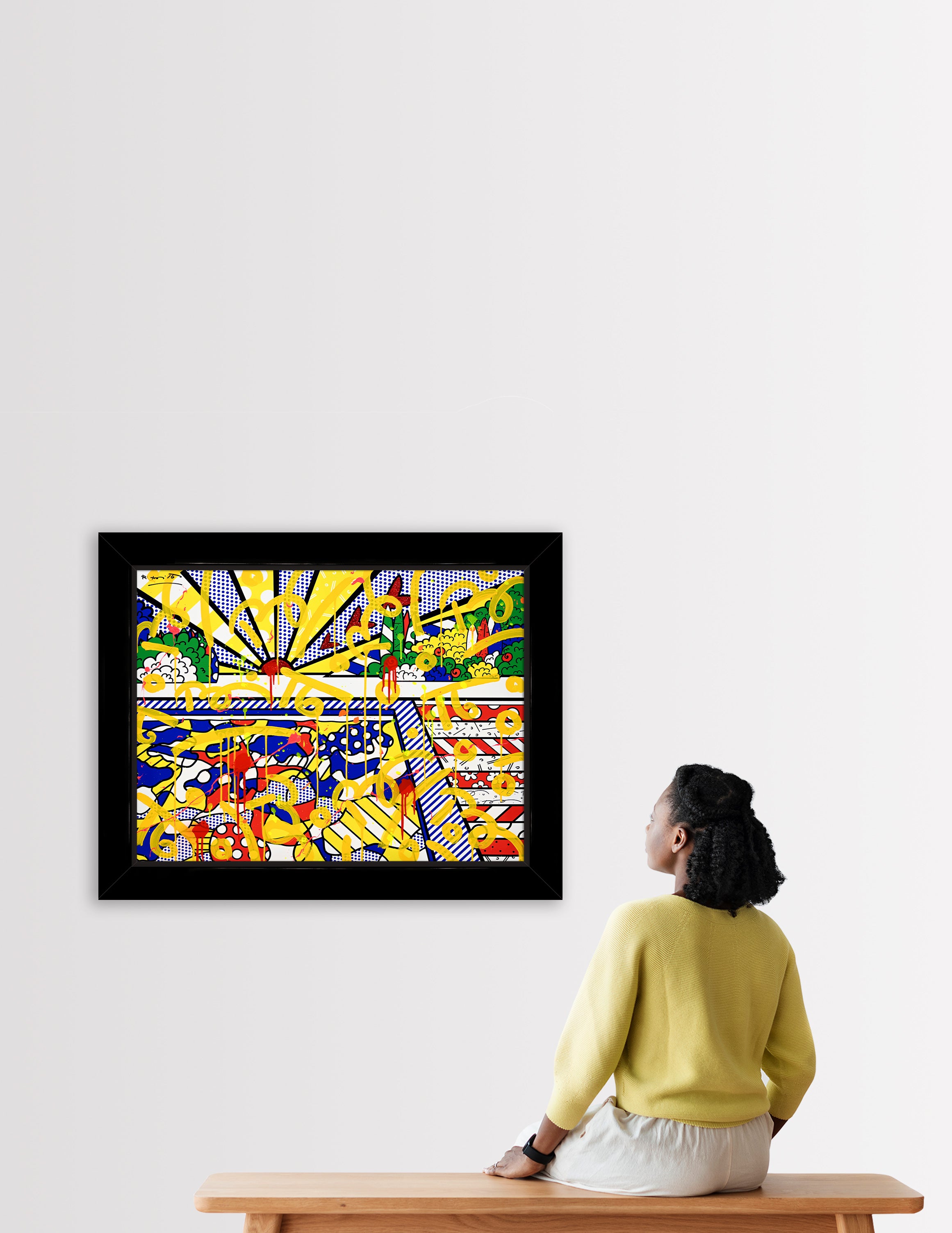 “California Pool” is a lively mixed media original that captures the sun-soaked energy and vibrant lifestyle of California poolside scenes. Using acrylic paint, oil pen, and spray paint on canvas, and enhanced with diamond dust embellishments, Romero Britto transforms this everyday leisure moment into a bold, colorful pop-art composition full of joy, movement, and contemporary visual excitement.