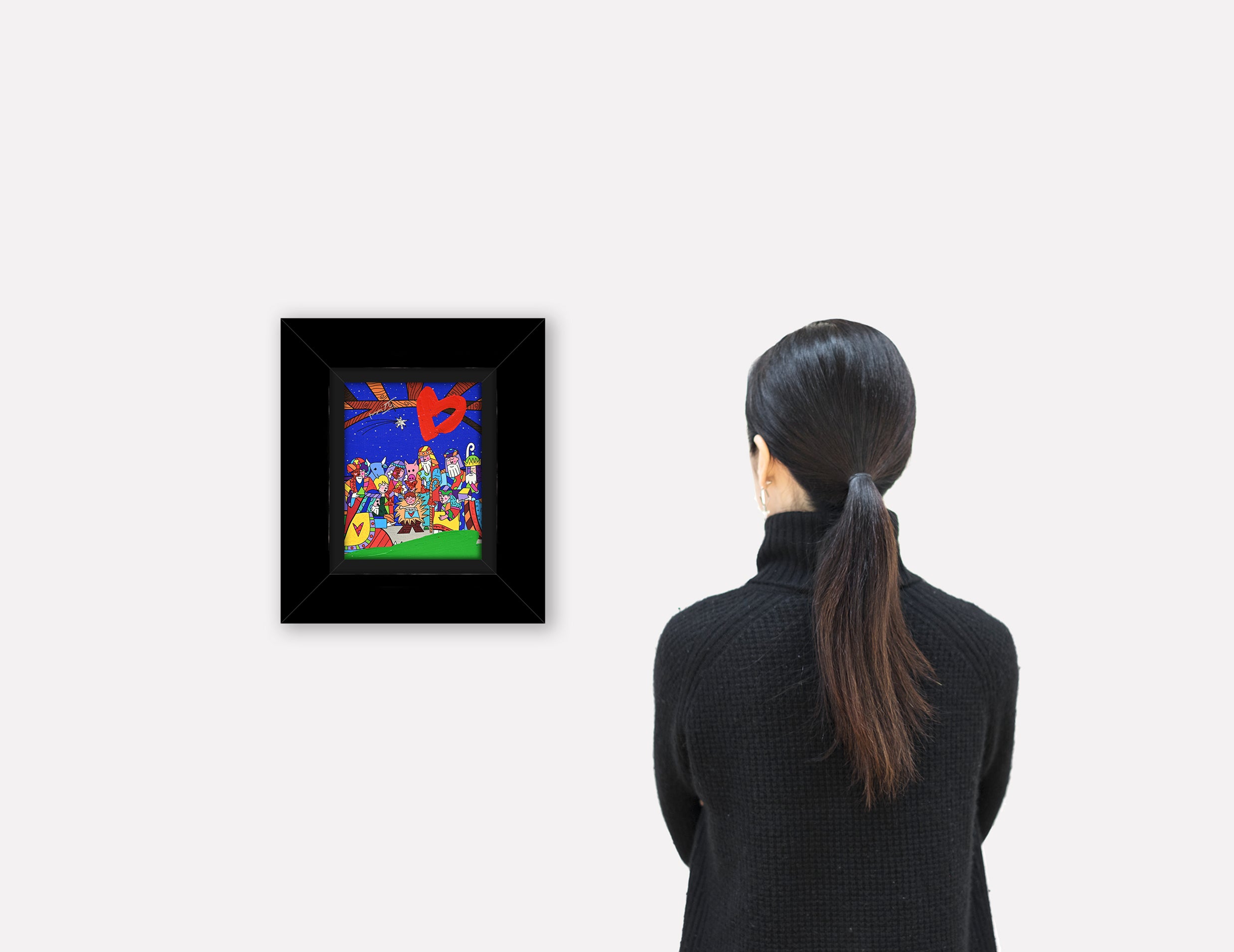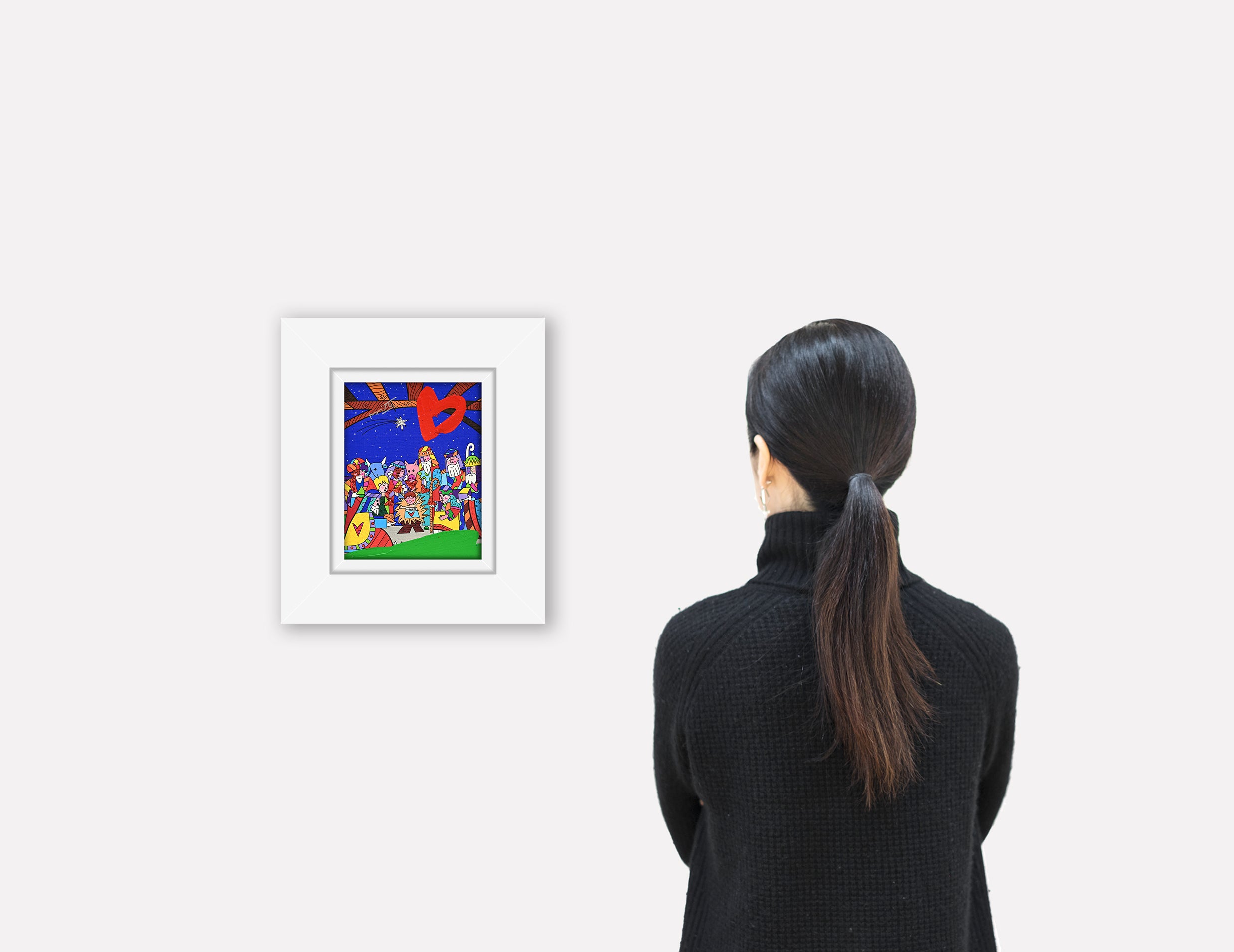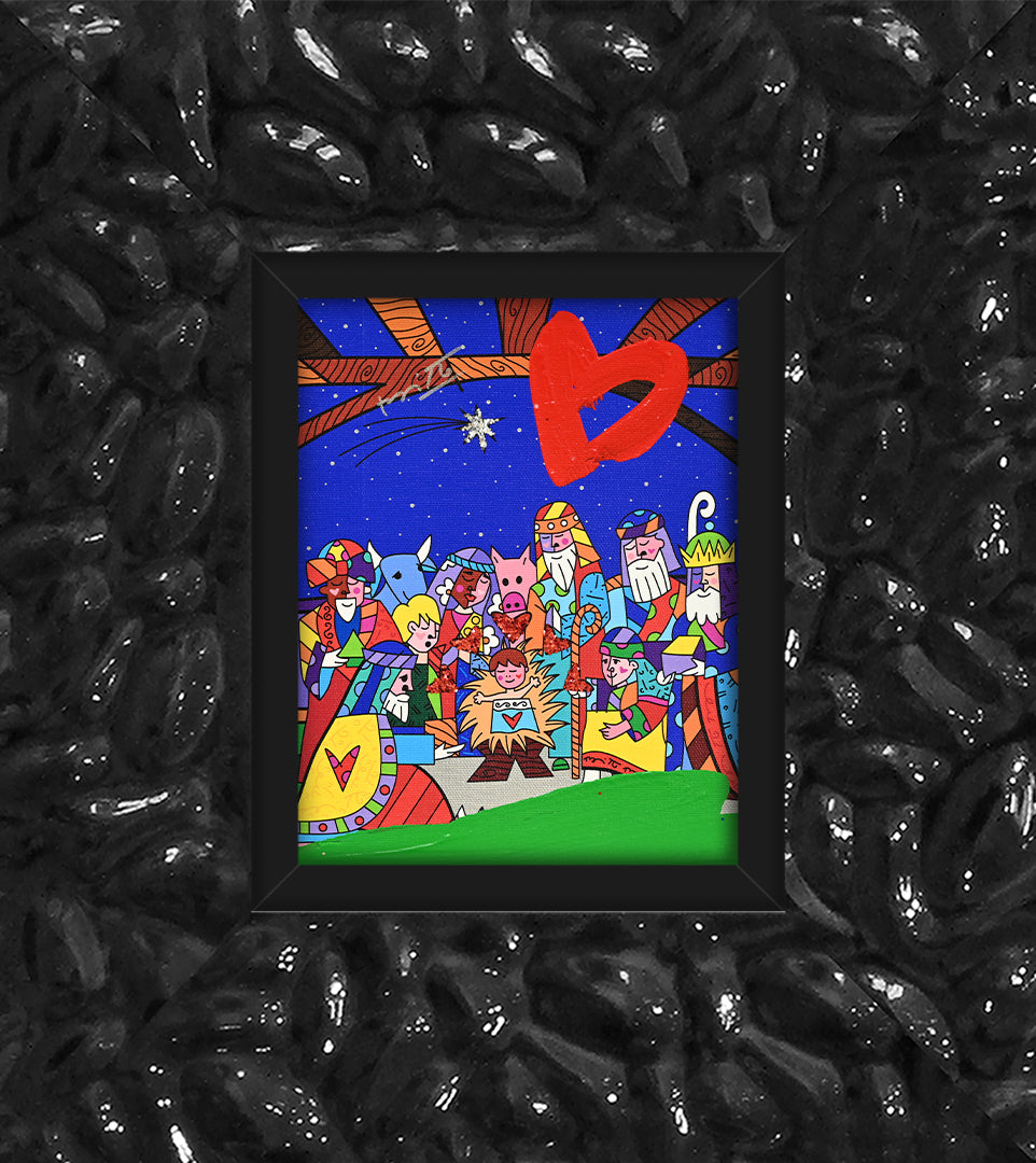 “Christmas” is a vibrant mixed media original that celebrates the birth of Jesus through Romero Britto’s bold color and joyful style. Depicting Jesus as a happy child with a heart on his blanket, the piece captures the love, warmth, and festive spirit of the holidays, transforming an iconic nativity scene into a lively and uplifting pop-art composition.