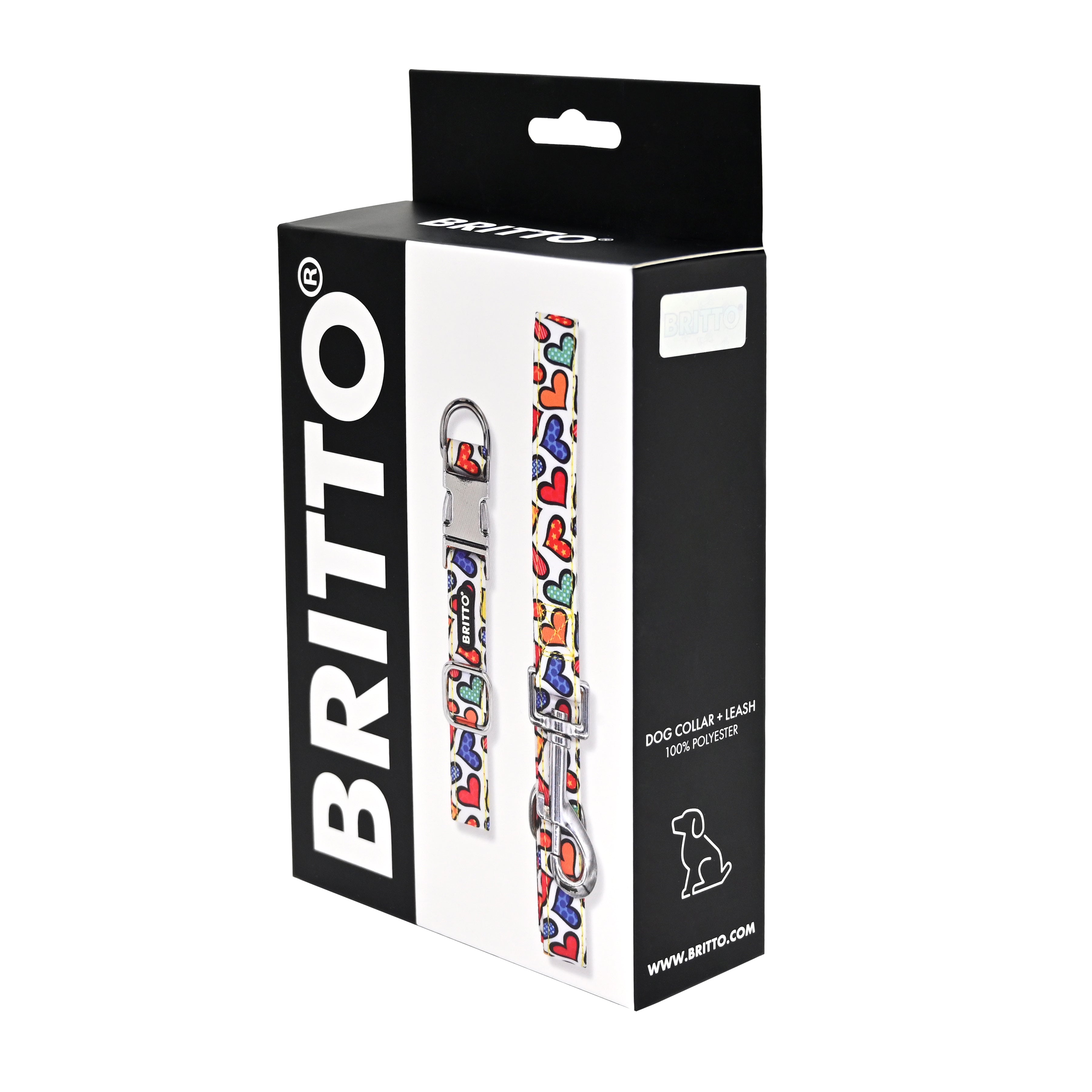 Crafted from durable polyester and metal, these collars and leashes are adorned with the iconic designs of Romero Britto, adding a touch of artistry to your furry friend's accessories.