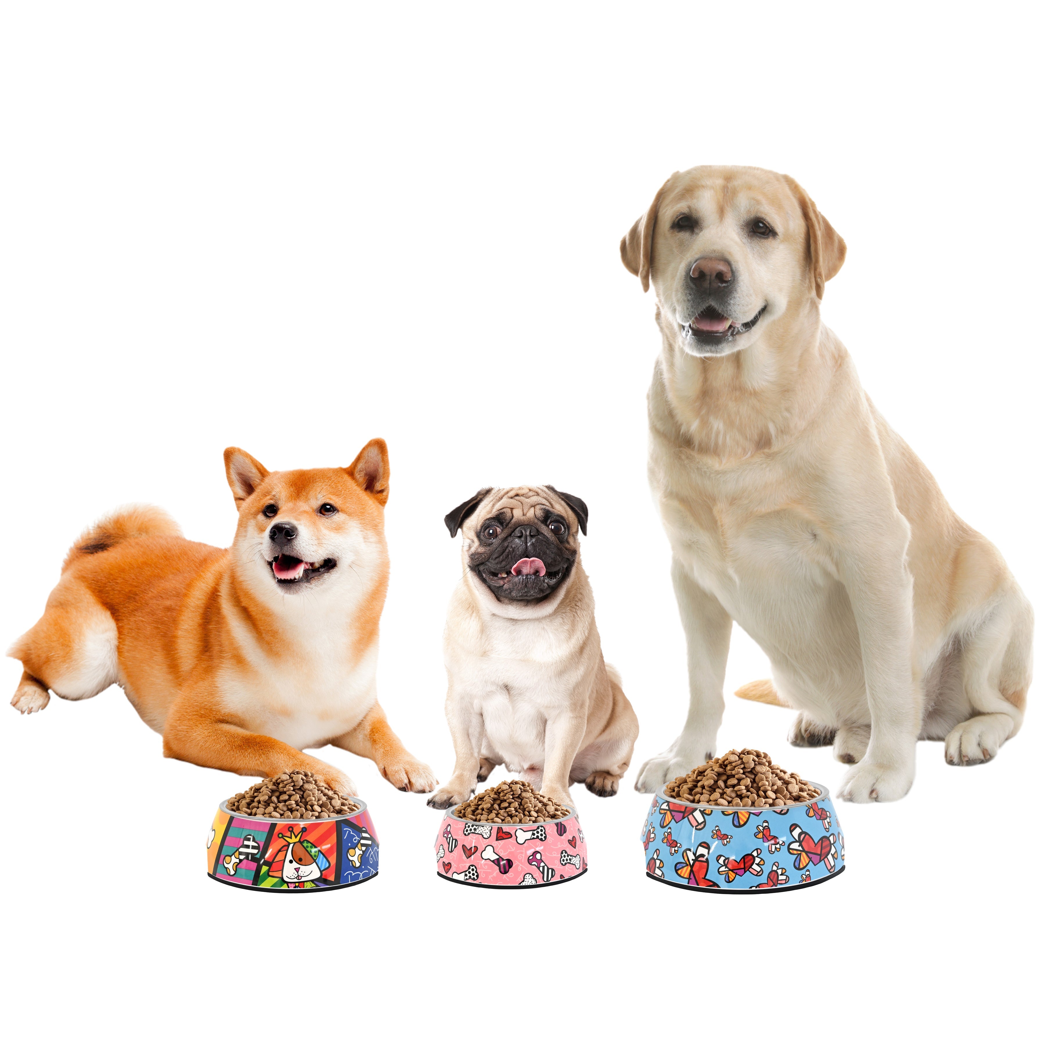 Featuring colorful and playful artwork by Romero Britto, these pet bowls add a splash of joy to your pet's dining experience.