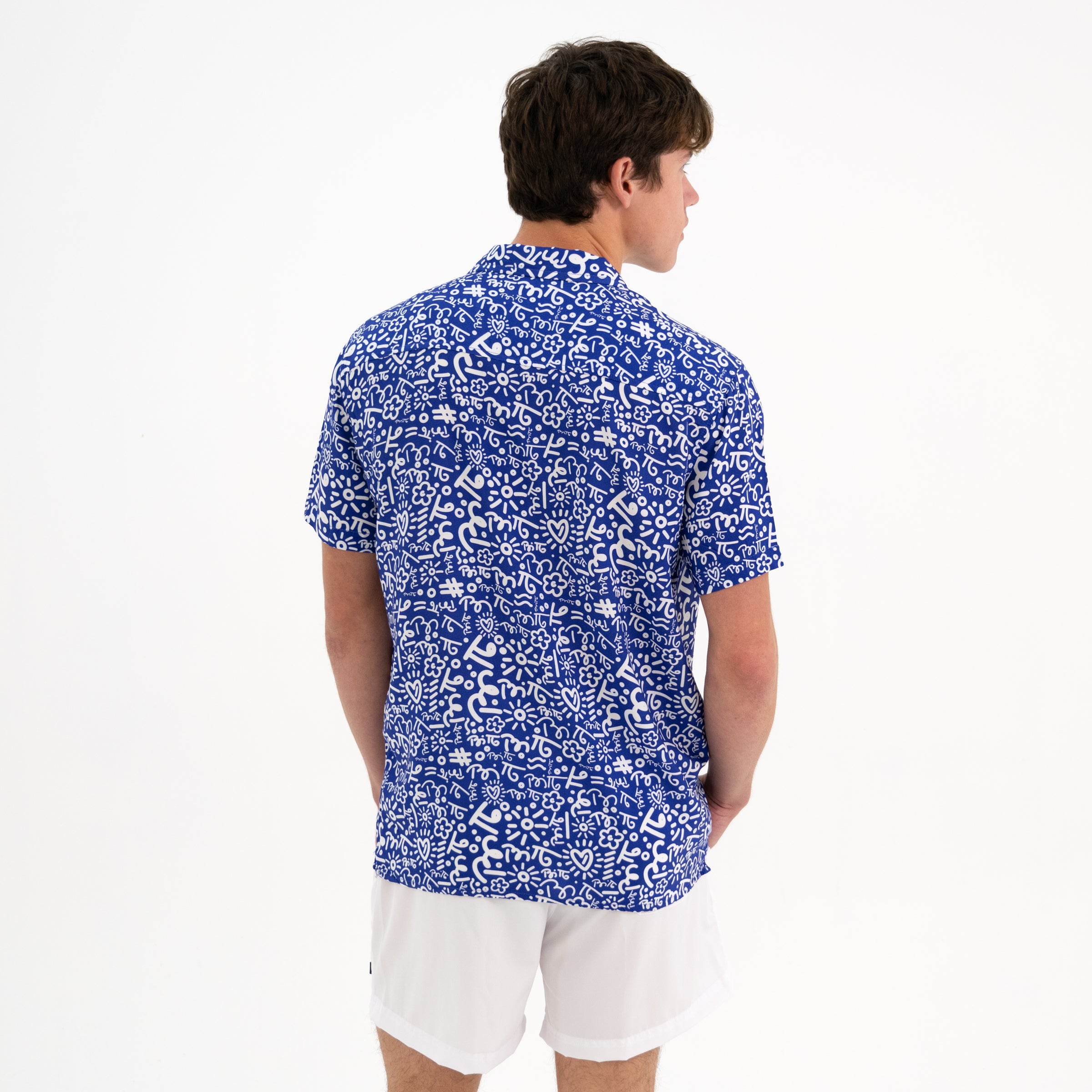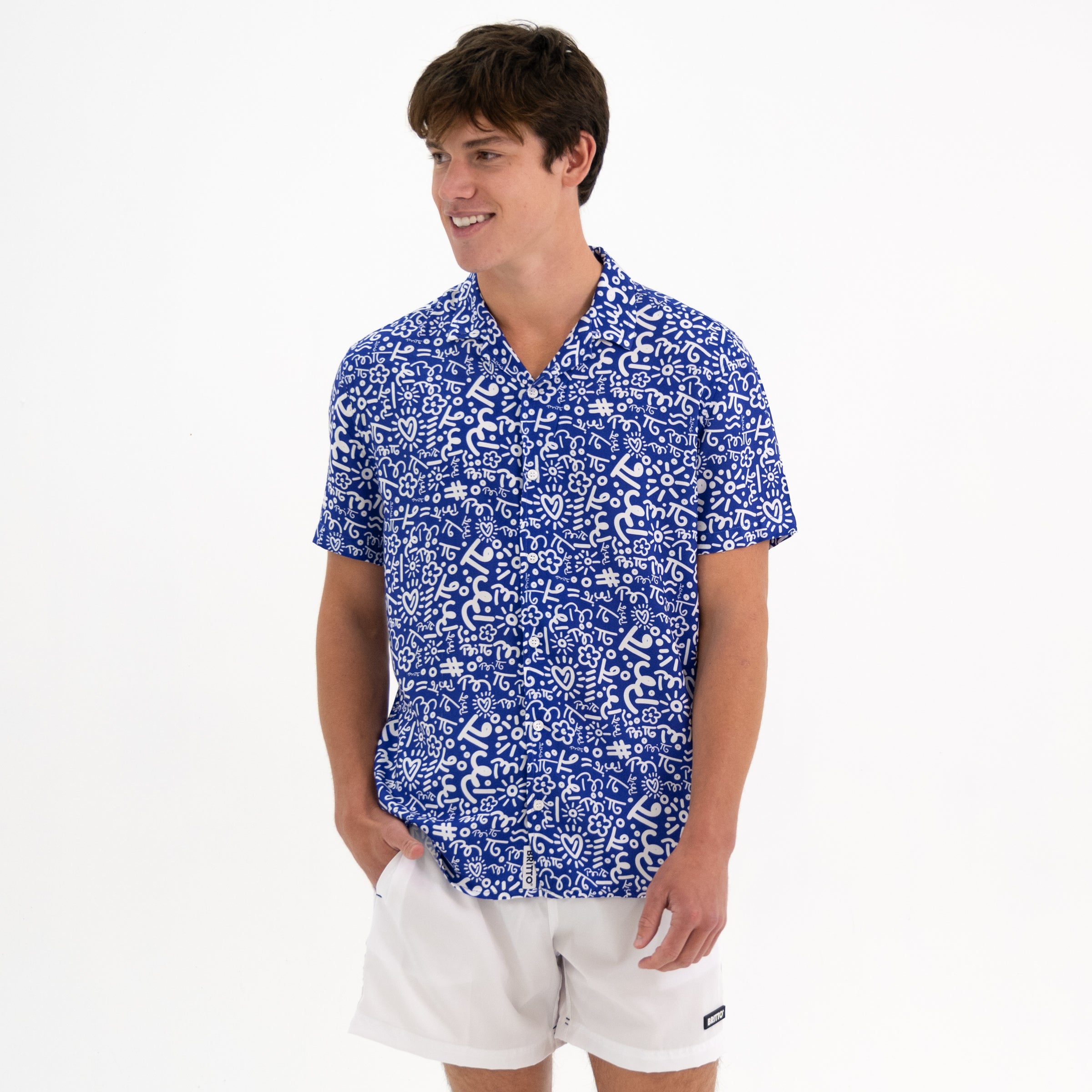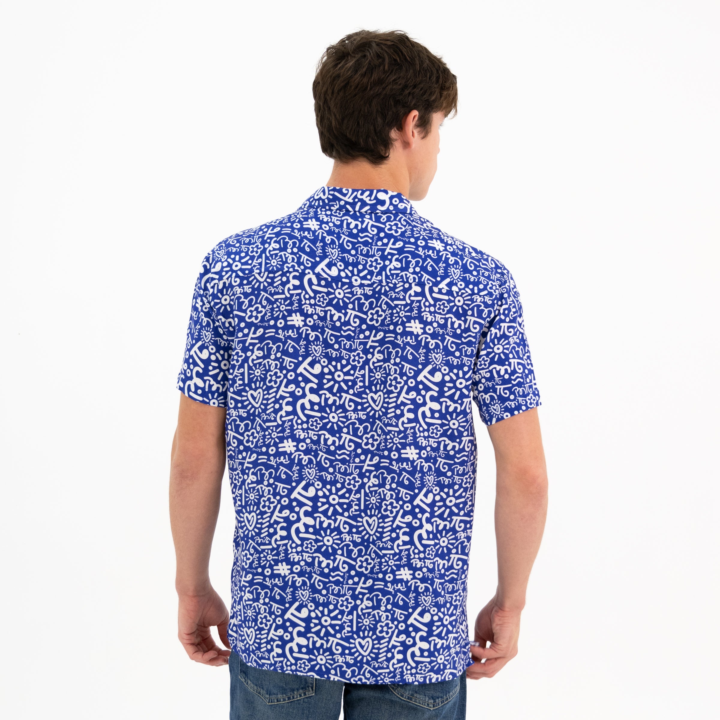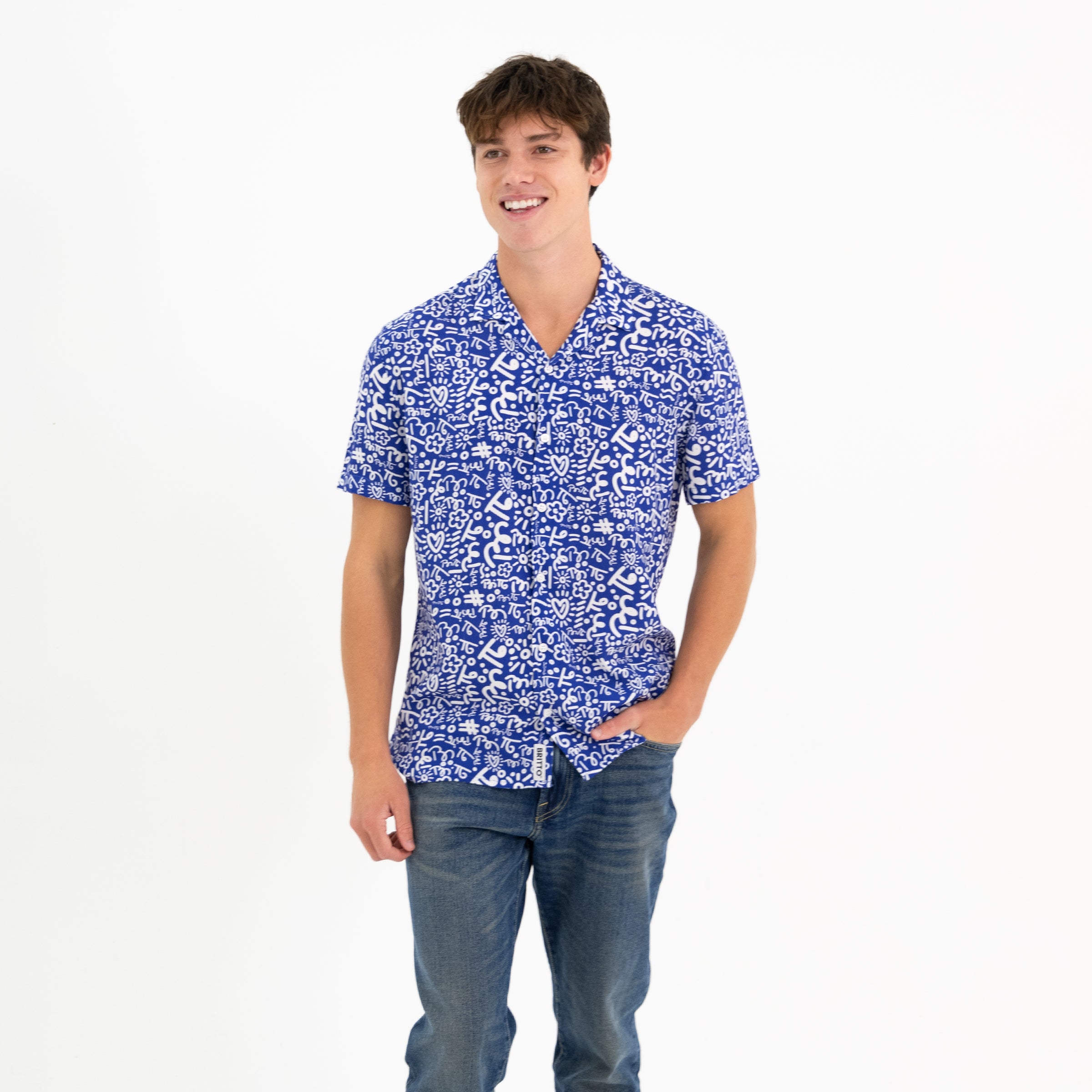 BRITTO® MEN'S SHORT SLEEVE BUTTON DOWN SHIRT - BLUE/WHITE GRAFFITI
