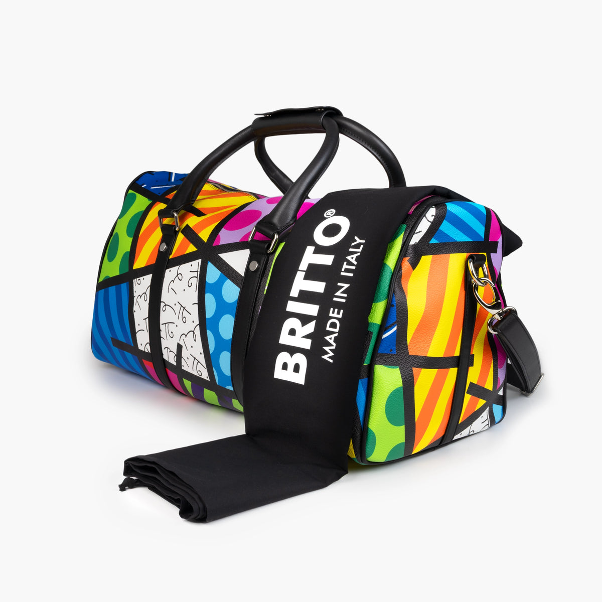 Carrying this bag is comfortable and versatile – use the padded, removable shoulder strap for hands-free wear or the soft haul handles for a quick grab-and-go. Whether you’re a frequent flyer, a fashion-conscious traveler, or simply heading on a weekend getaway, the Britto World Duffle elevates your travel gear with its artistic design and practical features. Durable Italian craftsmanship ensures it will withstand the rigors of travel while turning heads as a functional piece of art. Travel in unique fashion and carry your essentials with flair using this one-of-a-kind luxury duffle