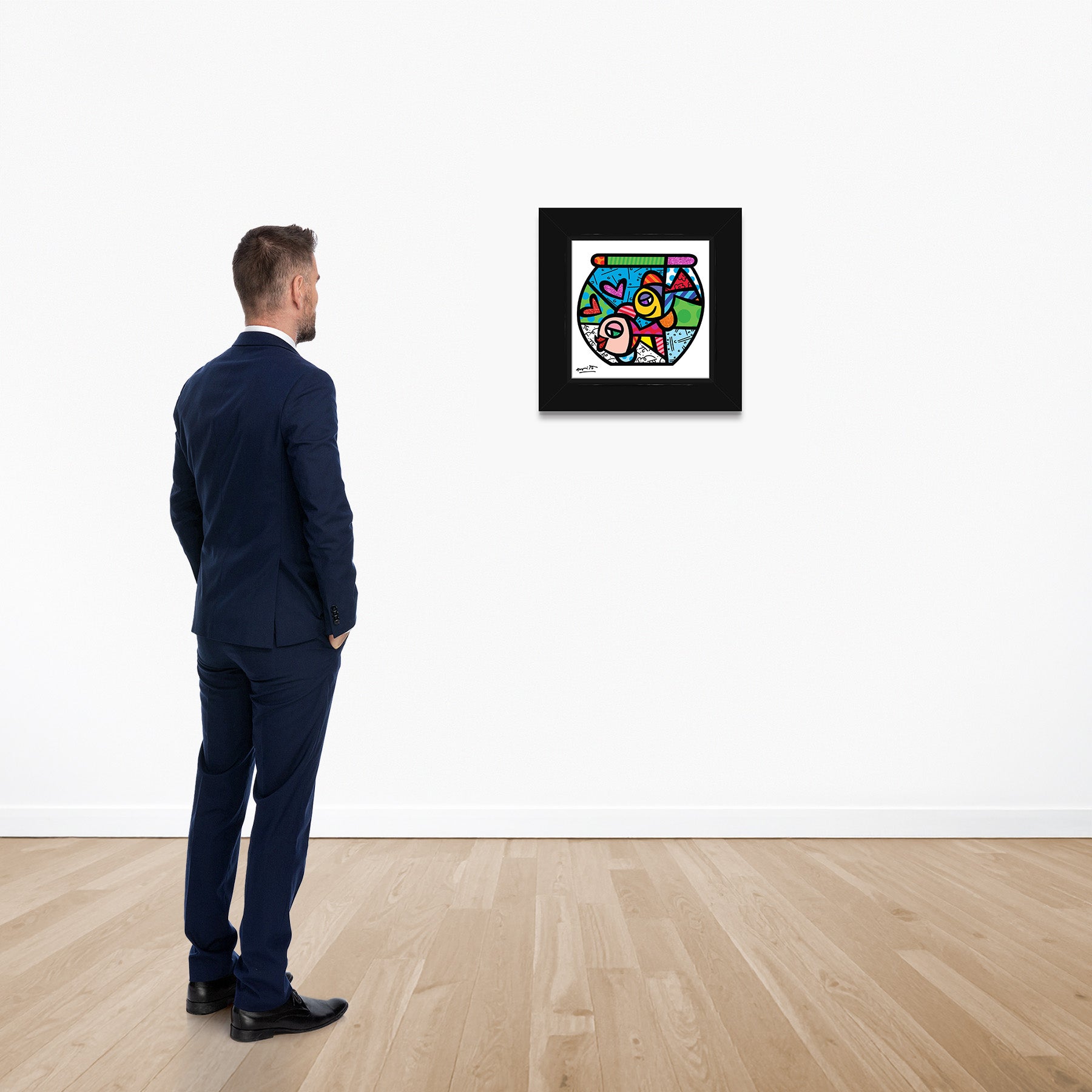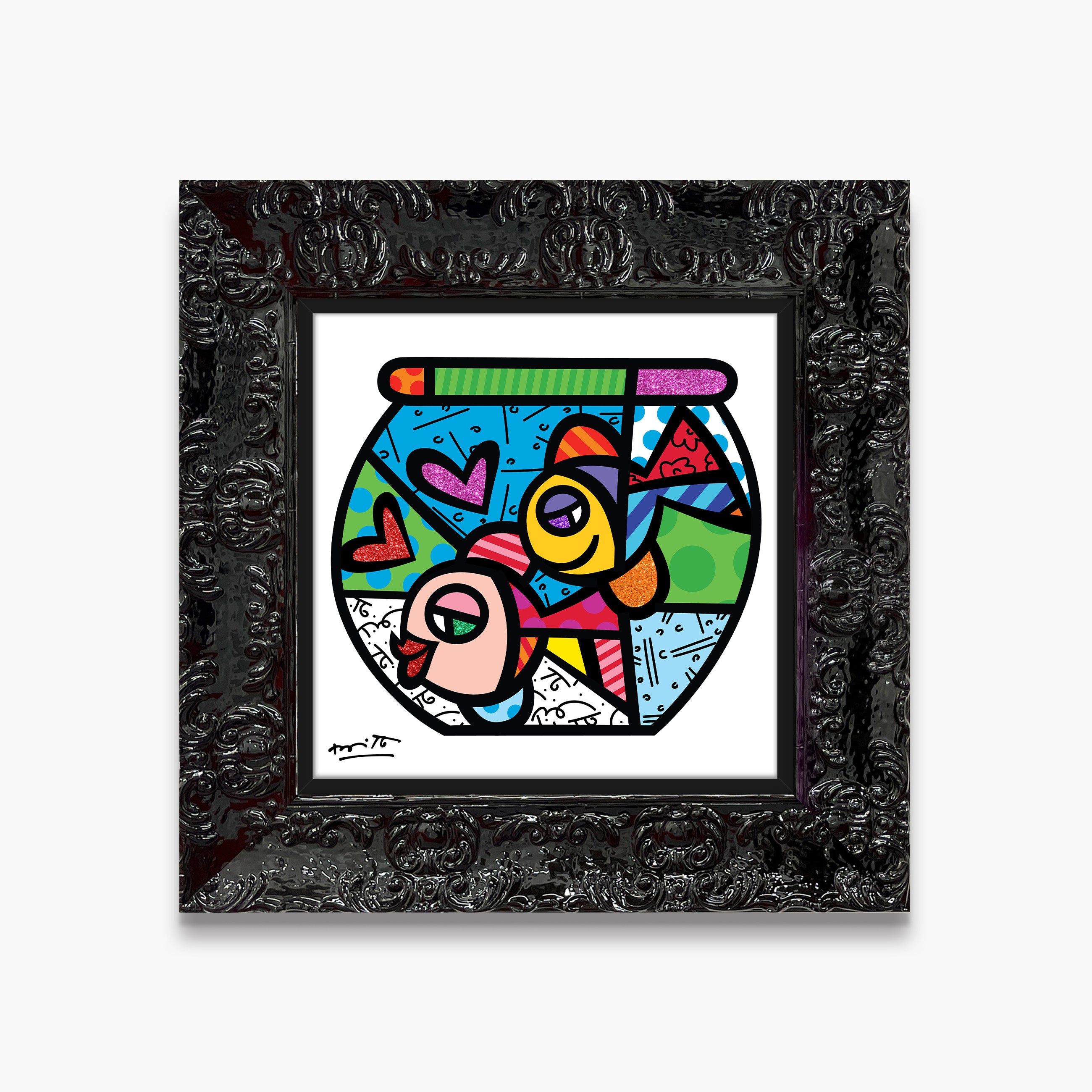 "Fishbowl" is a captivating digital print on canvas, enhanced with sparkling diamond dust embellishments. This piece draws inspiration from the concept of elevating an everyday pet into the realm of fine art. Romero Britto, known for his vibrant and joyful style, transforms the ordinary into the extraordinary, encapsulating the charm and simplicity of a familiar fishbowl in a new, artistic light.